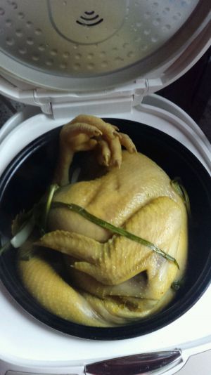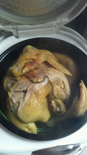 盖上盖按下煮饭键,等电饭锅到保温的时候,打开电饭锅,倒出多余的汁水,将鸡换一面继续按煮饭键焗。