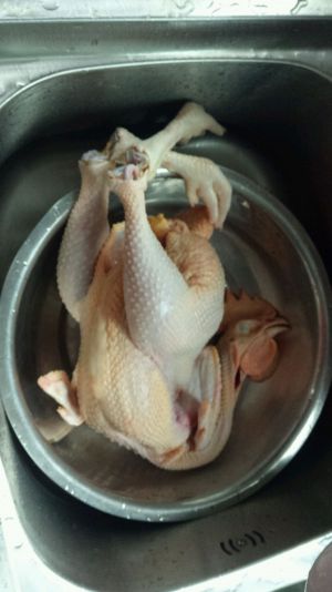打开保鲜膜,将鸡内外清洗一遍。再抹上薄盐,和花生油。