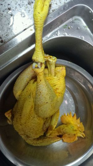 用盐和姜黄抹匀鸡身及内腔,然后用保鲜膜包好入冰箱上层冷藏至少8小时.