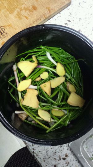 将洗净的葱和姜切片放在电饭锅底部,事先须将电饭锅均匀地抹上一层花生油。