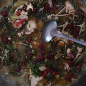 (吃了一半、才想起照照片)冷锅热油、放入鱼骨块、翻炒、加水、继而放入调料、等煮开放入海带、豆腐、金针菇、带鱼骨熟后、只捞出鱼骨放入盆中、再煮一会、继而放入鱼片煮熟后、全部倒入盆中、另起一锅、放入花椒、干辣椒、煸炒出香味、淋在鱼上、撒上香菜和葱花、即可食用