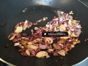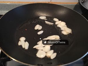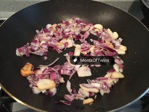 蒜片微黄,放入洋葱丁继续翻炒,带香味散出。