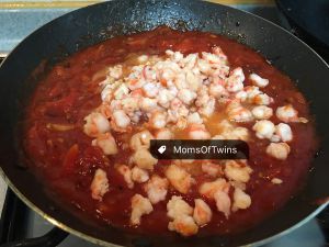 备料。虾仁取虾线,切段。葱头切碎,蒜切片,西红柿切丁。