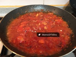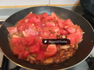 放入西红柿丁,翻炒,直到西红柿软糯成泥。