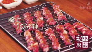 ▲烤箱提前预热到200度,把腌好的肉串放到烤架上。