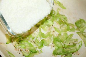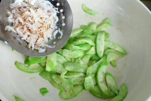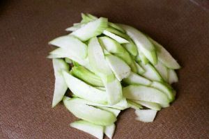 热锅后放油,先倒入丝瓜片翻炒,丝瓜片水分比较大,翻炒越1分钟即可变软。再倒入虾皮一同翻炒。