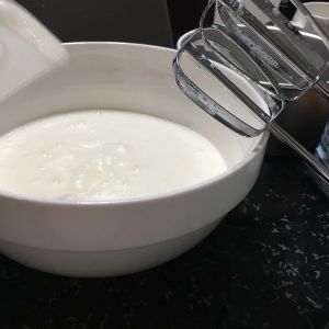 先把蛋清和50g细砂糖用电动打蛋器打成干性发泡状态