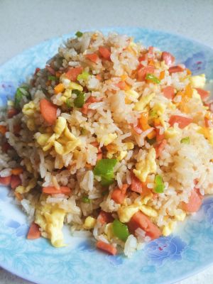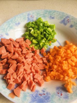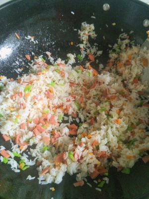 倒入切好的青椒,胡萝卜,火腿继续翻炒,随后加入炒好的碎鸡蛋,盐,生抽,醋