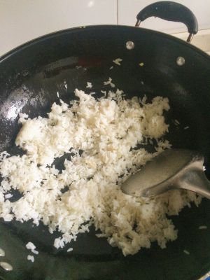 锅中倒入橄榄油烧至六成热,倒入米饭,翻炒,将米粒炒散
