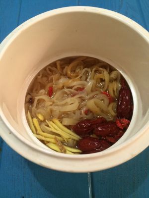 枸杞红枣姜丝花胶放入炖盅,放水刚好没过食材即可,隔水炖1个钟。