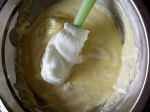 把打发好的蛋白分三四次加入搅好的蛋黄里面