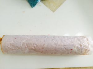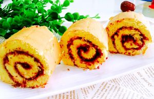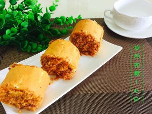 切口两端抹上杨梅酱,裹上肉松香甜可口,咬一口,嗯!满满的都是幸福感。