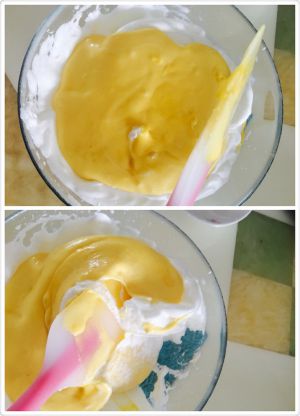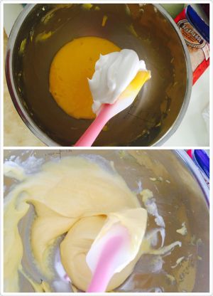 最后将拌好的蛋黄糊全部倒入蛋白糊中快速翻拌匀(採用切拌或翻拌手法,不能划圆圈,以免消泡),即成蛋糕糊。
