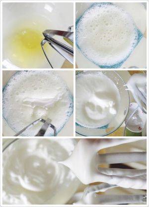 再做蛋白糊(蛋白盆要确保无油无水,否则影响蛋白的打发),分三次加人细砂糖,蛋白中挤几滴柠檬汁,加三分之一细砂糖,电动打蛋器高速打发至浓密的细泡,再加糖打至湿性发泡,再加最后三分之一细砂糖中档打发至硬性发泡,低档提起打蛋器能见打蛋头上短而直的小尖角。