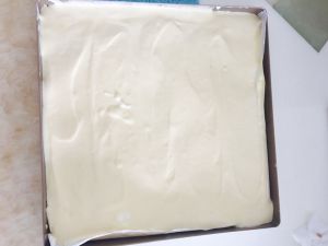 打蛋白的同时预热烤箱,上下火180度5分钟,蛋糕糊倒入垫好油纸的烤盘中,划之字抹平,振出大汽泡,送人预热好的烤箱中,上下火170度烤30分钟。