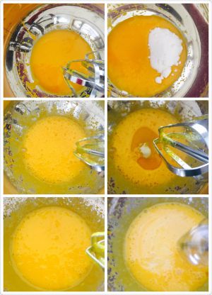 首先做蛋黄糊,将蛋黄用打蛋器打散,加入细砂糖打匀,加入色拉油打至无油水分离,加入牛奶搅打匀。