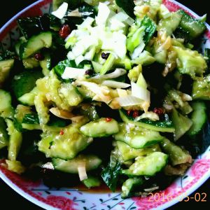 将锅内热油热到花椒,红辣椒刚刚变色,可以闻到香味起锅,两热油直接淋到黄瓜蒜末上