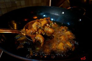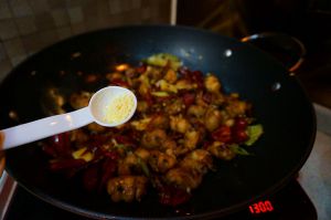 下入炸好的鸡翅,转大火迅速翻炒均匀