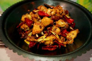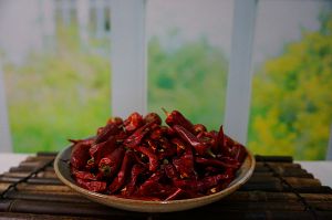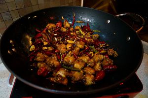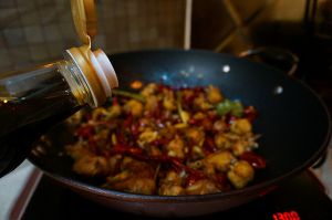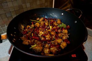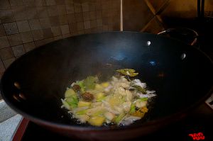 再下入干辣椒段儿,爆炒至辣椒呈枣红色