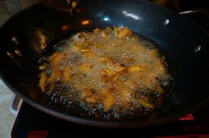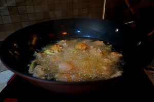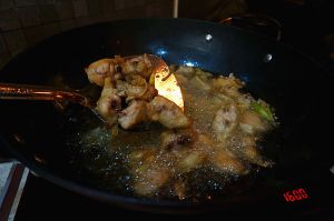 锅内上油,,烧制七成热时候迅速一个个把鸡翅下入锅,用筷子搅一下,以免煳锅