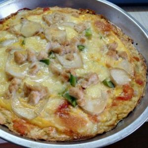 去除烤好的饼底,涂上披萨酱,铺上蘑菇,撒上适量圆葱和青椒粒,再放上一些马苏里拉芝士,将剩下的一般鸡蛋液浇在上面,最后放上鸡胸肉粒,放入微波炉,还是烤约200℃,15min即可~