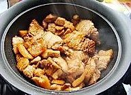 加入生抽、老抽和白糖,继续煸炒。加入一小碗开水,炖10分钟。