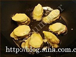 锅中油六七成熟,放入茄盒,炸到两面金黄色至熟即可。
