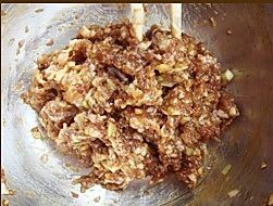 将猪肉铰馅、加葱末、姜末、香油、色拉油、盐、白胡椒粉、料酒少许、生抽、老抽少许调色,沿一个方向搅成馅料;