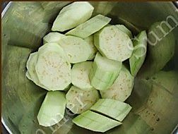 长条茄子去皮,切块,中间划一刀,不要断开;