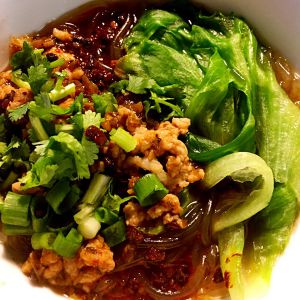 然后,在碗里调酱汁,酱油、醋是主要的多放一点,再放一点麻辣烫底料,还有香油、花椒油、鸡精。把煮粉条的汤(滚开的)盛进酱汁里,再把粉条捞进来,把菜铺好,撒上碎米芽菜肉末,香菜、香葱。一碗热气腾腾的酸辣粉就做好了。