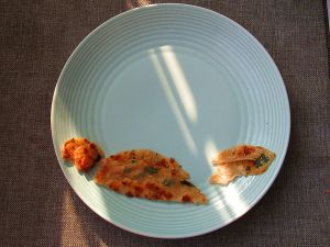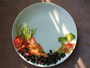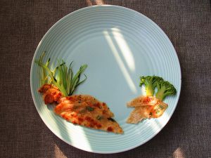 把酱香饼剪成几个地面土包形状摆好,土包下面可以铺藏一些炒好的小菜,这样既可以吃到菜又可以让餐盘画整体不影响美观
