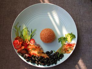 接着铺好黑豆做地面装饰,草莓切片做彩色景物,再摆上炒过的香菇,香菇炒过以后,会变成黑色,用来做色彩装饰效果可少不了它哦