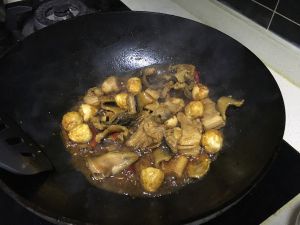 加少量水,并把虎皮蛋放入锅中,加入料酒,翻均匀后,盖锅盖焖煮,用中火