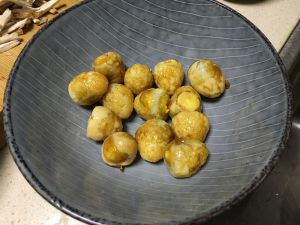 锅内多放点油,把鹌鹑蛋表皮炸出虎皮