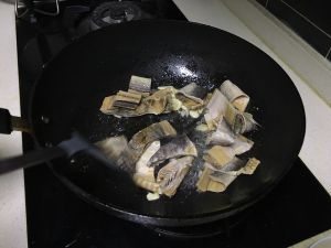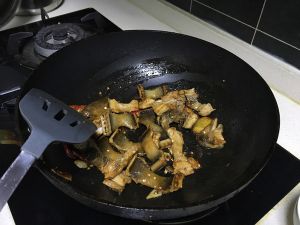 将干辣椒掰段放入锅中,并淋入酱油和蚝油,继续翻炒