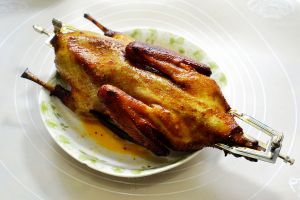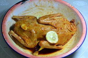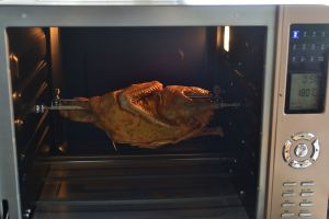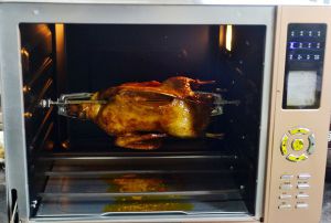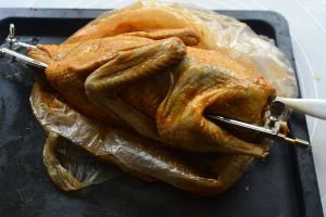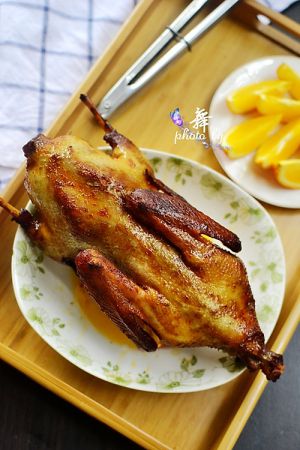 放入烤箱启动烤鸡模式,旋转烤制,时间160度55分钟左右(中间可以打开刷下腌料)