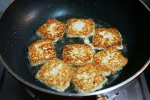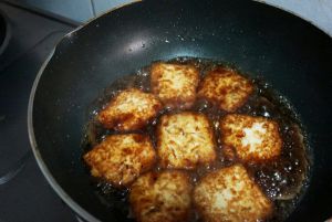 锅中放入适量油,凉油放入豆腐块,中小火煎制。期间,借助筷子和铲子翻面,直至两面金黄。中途根据豆腐的颜色可变换火候,不要煎糊。