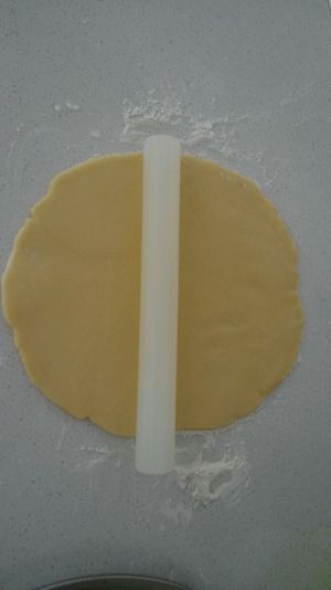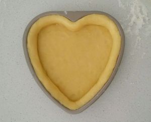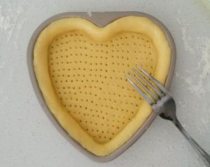 准备一个学厨爱心不沾模,将派皮放入模具内,轻轻按压平,擀面杖擀掉多余的派皮