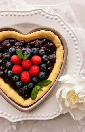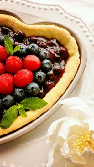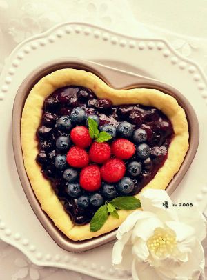 将熬好的蓝莓酱均匀倒入派皮内,中间摆放上新鲜的树莓和蓝莓