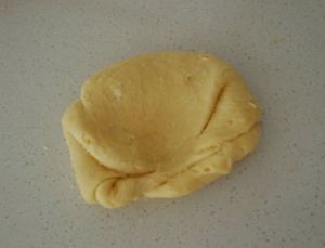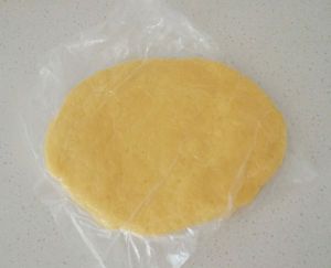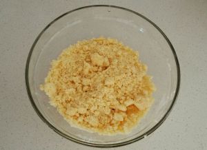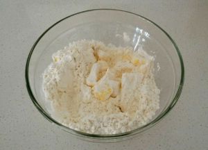 用手将黄油低粉捏成如粗的玉米粒,加入冷水、盐、蛋液