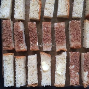 用黄油刀将面包条的一侧涂上薄薄的一层黄油,有黄油的一侧在碟子里沾上可可砂糖。