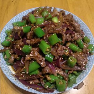 倒入洋葱炒至5分熟加少许盐,加青椒段,炒5秒,倒入煸干的羊肉,倒入大蒜粒,旺火炒半分钟关火,放熟芝麻和匀,装进铺了香菜的盘子,可以淋一点香油