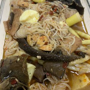 之前的豆芽铺底,放上花蛤,蛏子。将烧好的毛血旺直接一起倒入,豪华版毛血旺就成功了。