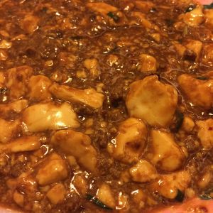 加入酱料,翻炒一下,放入划成小块的豆腐,翻炒,盖锅盖焖一下。