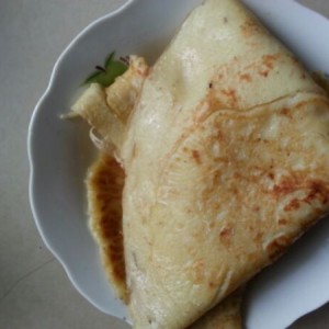 锅里放油,稍热,倒入搅匀的面糊,摊开,成圆形,
