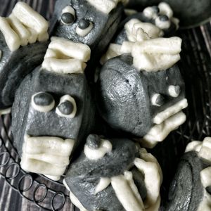 深色面团上喷点水,将白色面条随意的粘在深色面团上,记得留出眼睛部位
