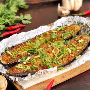 茄子放在烤盘上,垫上一层锡纸,用刷子刷上适量油;