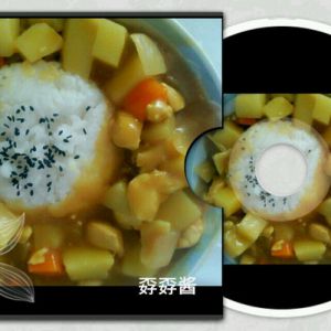 将煮好的咖喱浇在米饭上,一道美味的咖喱鸡饭就做好啦。P.S.喜欢摆盘的亲们可以将米饭用小碗盛,倒扣于盘子上,撒些黑芝麻