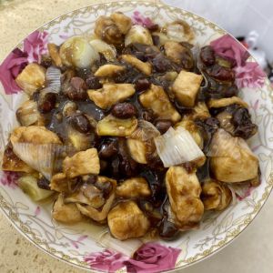 鸡胸肉切成1.5cm左右的小丁,加入料酒,生抽,淀粉腌5-10分钟