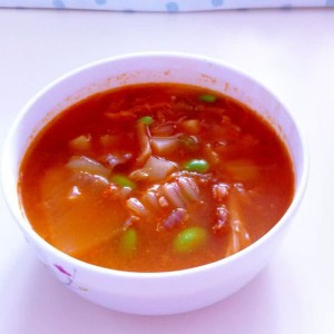 往汤里加入两勺辣椒酱,放入金针菇继续熬制